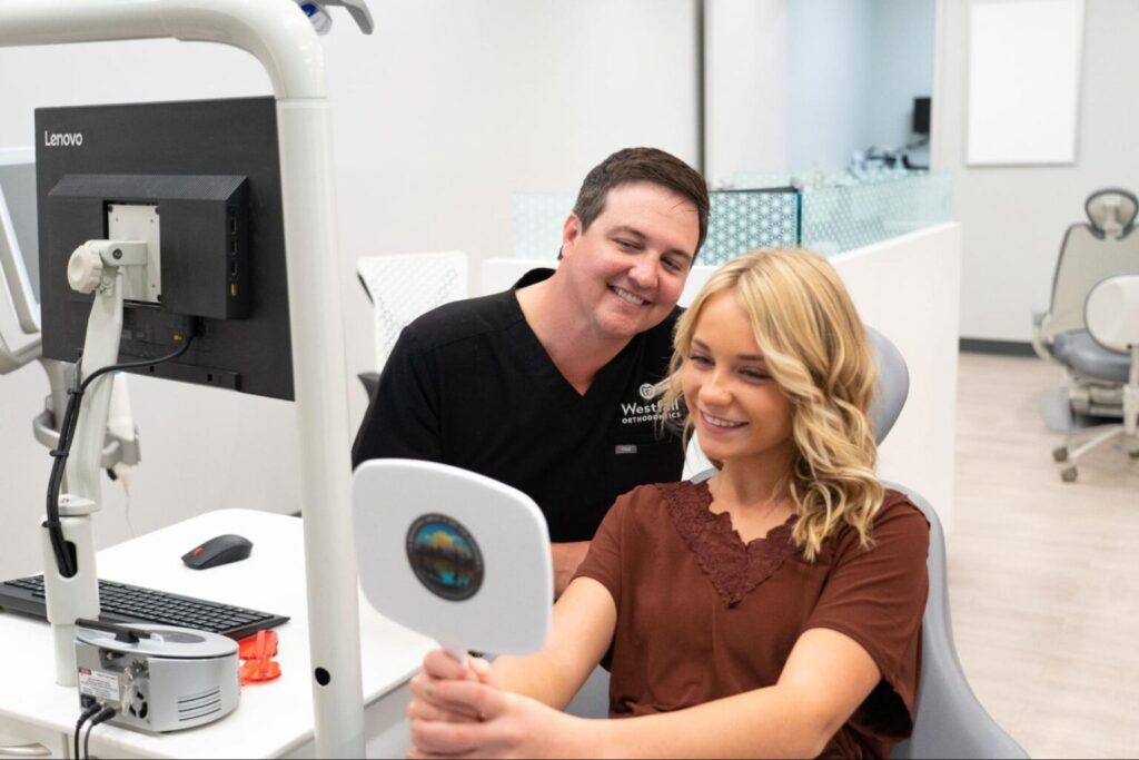 - Braces: Dr. Westfall or someone from our team will conduct in-office adjustments every four to six weeks. During these appointments, wires may be tightened or replaced, and bracket adjustments are made as necessary.