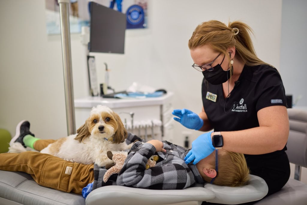 Favorite thing about Westfall Orthodontics: Molly our therapy Dog and Our patient’s beautiful smile transformations.